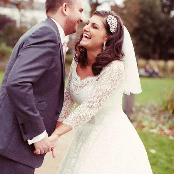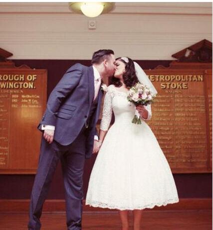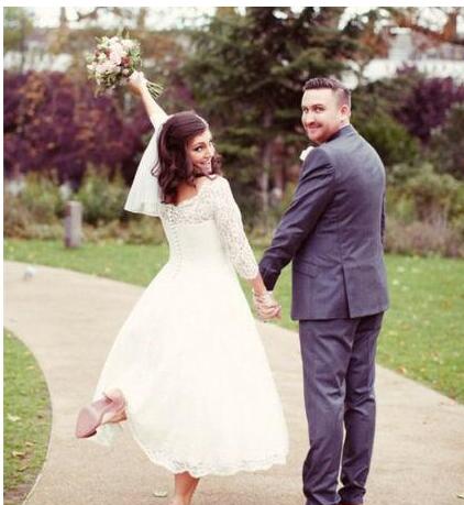 3/4 Long Sleeves Modest Short Lace Bridal Dresses Plus Size A Line Tea Length Princess Custom Made Wedding Gowns Vintage Transparent