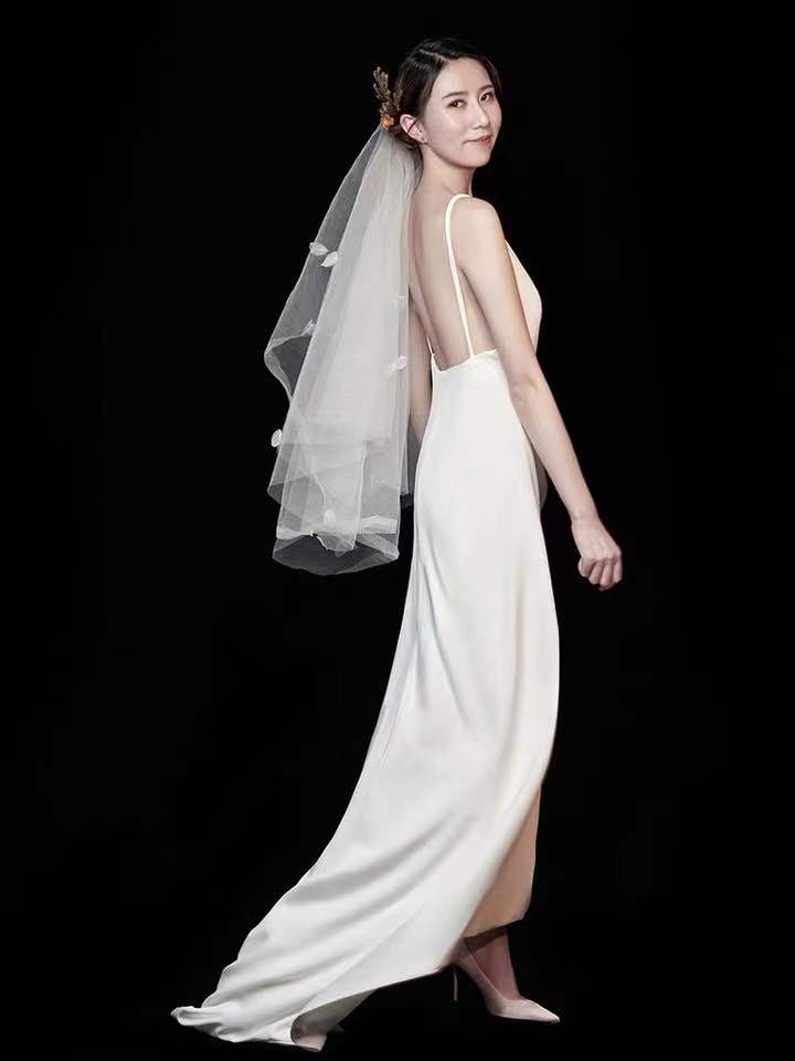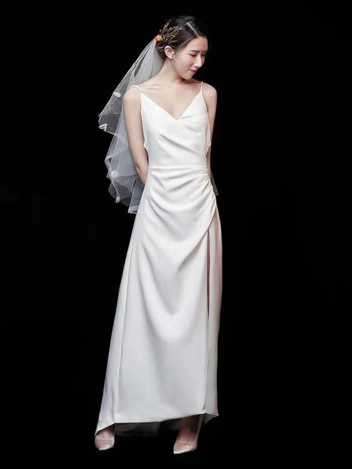 White Wedding Dress v Neck Wedding Dress Backless Wedding Dress Satin Long Wedding Dress
