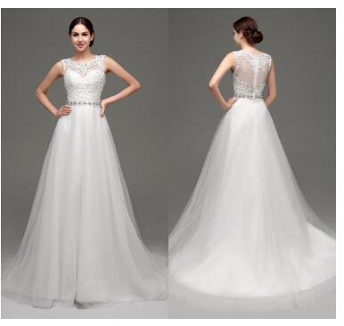 Lace Wedding Dresses Jewel Neckline Sheer Wedding Gowns Appliques Beaded Bridal Dress