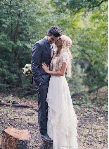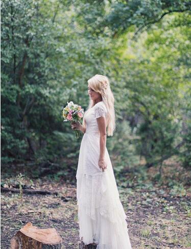Boho Lace Wedding Dresses with Short Sleeve A Line Sweetheart Floor Length back Zipper Vintage Beach Bridal Gown