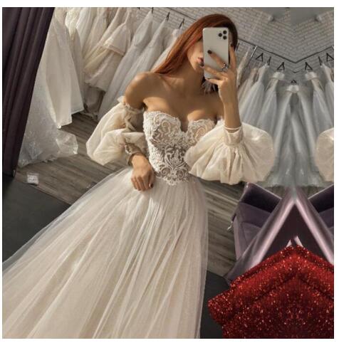 Boho Wedding Dress Sweetheart Appliques Lace A-Line Puffy Sleeves Princess Elegant Wedding Gown Bride Dresses