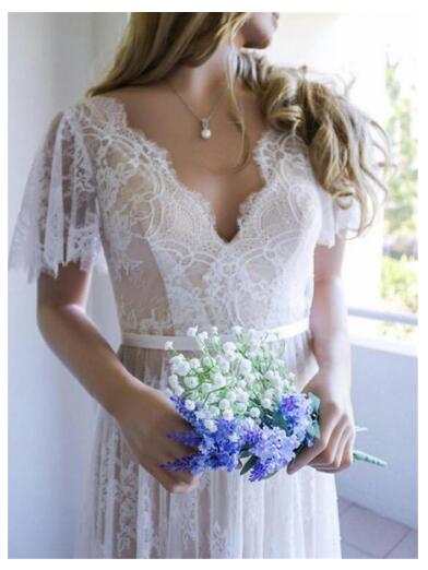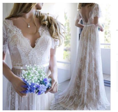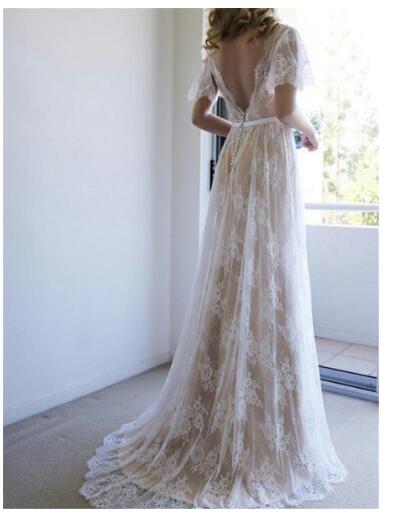 Champagne Lace V-neck A-line/Princess Train Brush Bohemian Wedding Dress Butterfly Sleeve Nude Bridal Dresses
