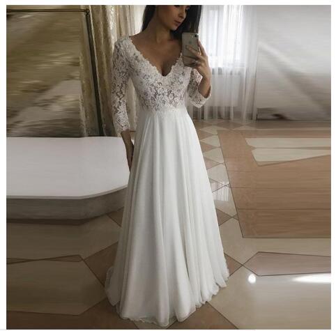 Long Sleeves Beach Wedding Dress Lace Chiffon Wedding Gown A-line V-neck Floor Length Bridal Dresses Vestido De Novia