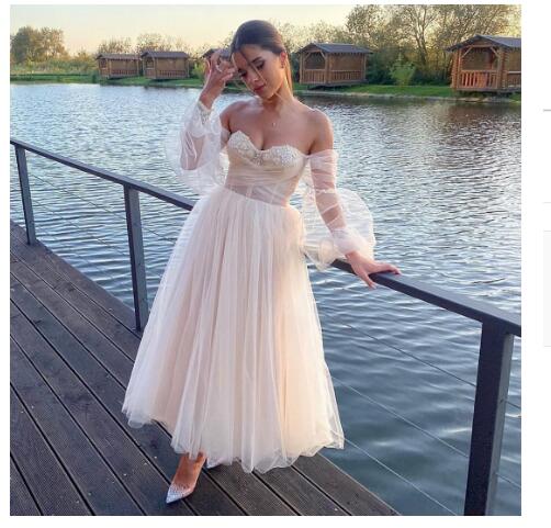 Short light Champagne Puff Sleeve A-Line Tulle Sweetheart Knee Length Bridal Length Crystal Beaded Beading