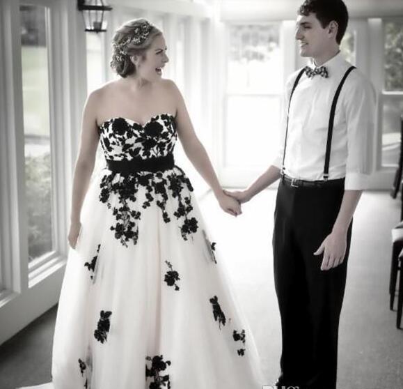 Vintage Gothic Black and White Wedding Dress Sweetheart Open Back Lace-up Lace Appliqued Tulle Bridal Gowns