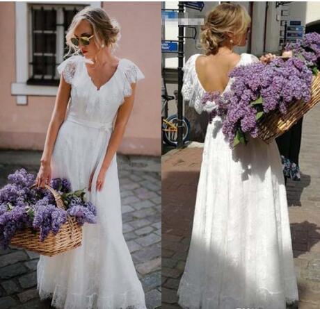 Generous Capped V Neck Lace A Line Wedding Dresses Sexy Backless Long Floor Bridal Gowns