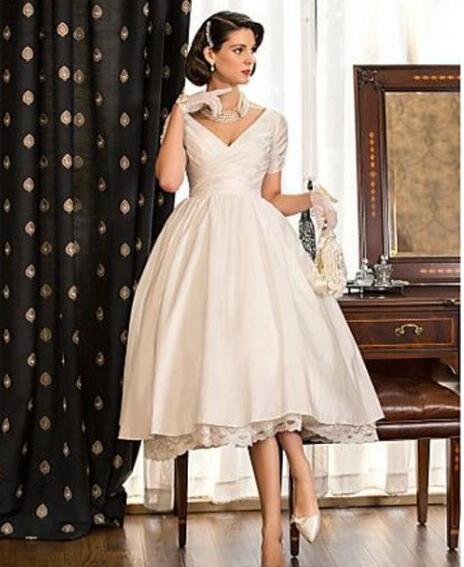 Tea Length Generous Wedding Dresses Short Seeves V Neck Lace Satin Bridal Wedding Gowns Custom Made