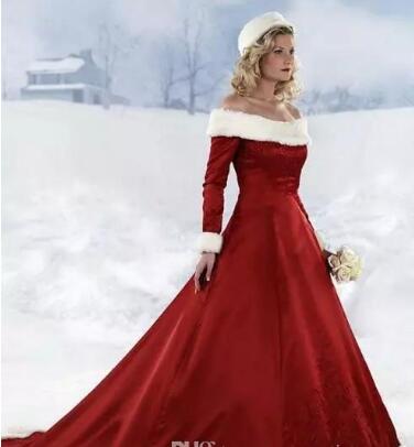 Long Sleeve Red Christmas dresses Hot New winter fall dresses A-line Wedding Dressesn Off-shoulder Satin Floor-Length Christmas Bridal Dress