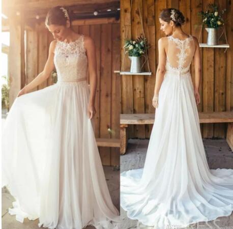 Ivory Chiffon Beach Wedding Dresses Crew Neck Appliques Lace Plus Size Wedding Dress Sheer Illusion Bodice Boho Bridal Gowns