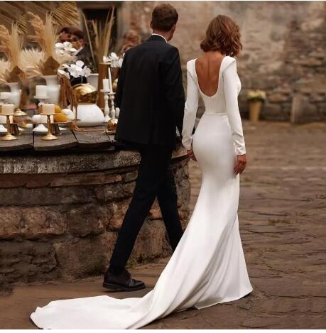 Elegant Plus Size Simple Satin Mermaid Wedding Dresses Long Sleeve Bridal Gowns Backless Court Train Bridal Dress Custom Made