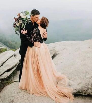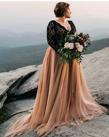 Plus Size Wedding Dresses Bridal Gowns Black Lace Long Sleeve V Neck A Line Sweep Trail Champagne Chiffon Floor Length vestido de noiva Customized