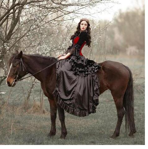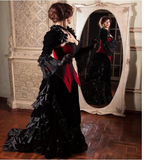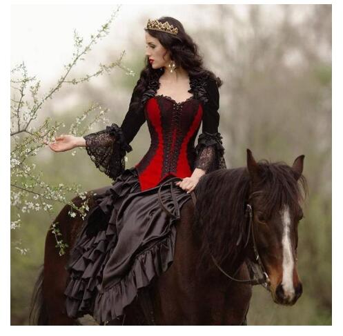 Vintage Black and Red Gothic Wedding Dresses with Jacket Long Juliet Sleeves Lace Ruffles lace-up Corset Back Sweep Train Wedding Gown