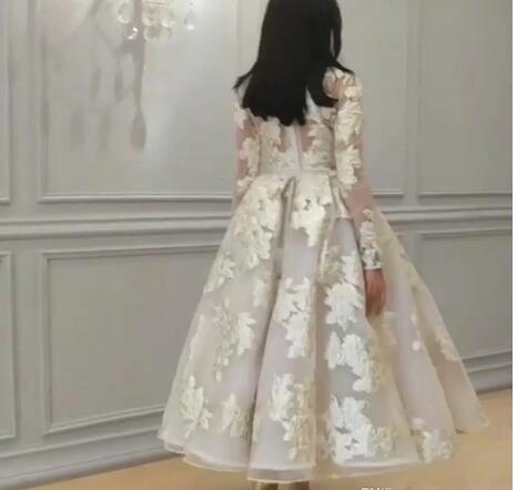 Arabic Ivory Jewel Neck Appliqued Long Sleeves A Line Wedding Dresses Winter Tea Length Bridal Gowns With Zipper Back