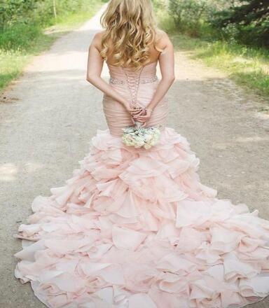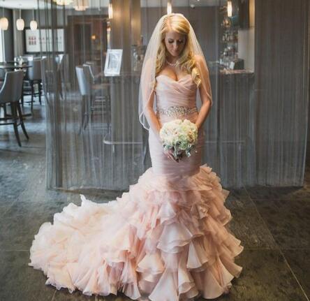 Sexy Blush Pink Mermaid Wedding Dresses Sweetheart Cascading Ruffle Wedding Gowns New Design Organza Trumpet Bridal Gowns Beaded Sashes