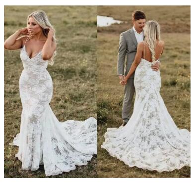 Sexy Boho Mermaid Wedding Dress Chic Rose Flower Lace Spaghetti Straps Open Back Bohemia country Bridal Gowns