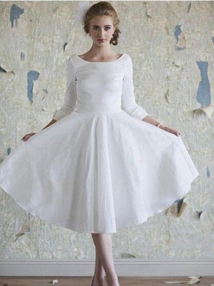 Tea Length Vintage Wedding Dresses Scoop Neckline Ruffles A-Line Taffeta 3/4 Long Sleeve Short Bridal Gowns Custom Made