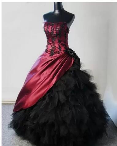 Gothic Burgundy and Black Wedding Dresses 2019 Applique Beaded Pleats Strapless Tulle Ball Gown Princess Bridal Gowns Vestidos De Noiva