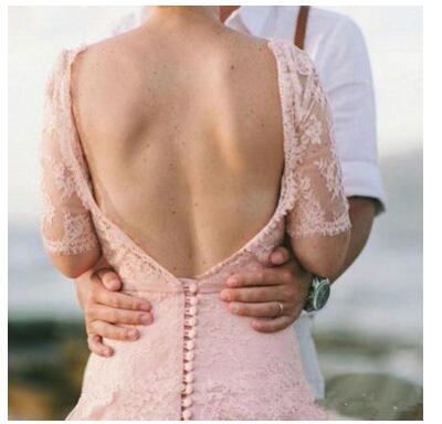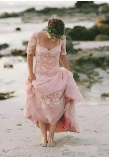 Vintage Blush Pink Country Wedding Dress Beach Wedding Dresses Lace Garden With Sleeve Full Length Backless Boho Bridal Gowns