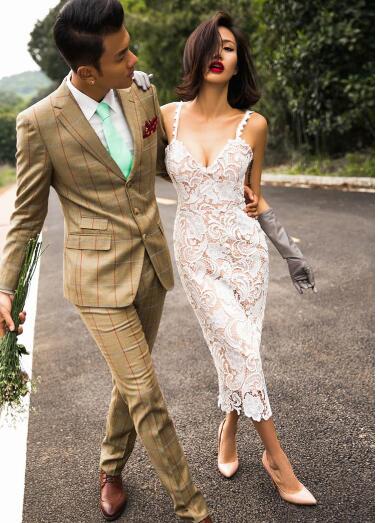 Sexy Wedding Dress Lace Mermaid V-Neck Sleeveless strapless Beach Illusion Backless Tea-Length Gown custom made