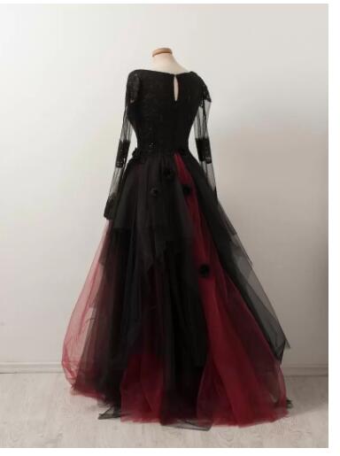 Black and Burgundy A-line Gothic Wedding Dresses Long Sleeves Low V Neck Sheer Sleeved Non White Vintage Bridal Gowns Custom
