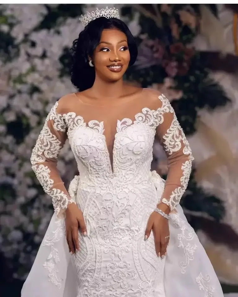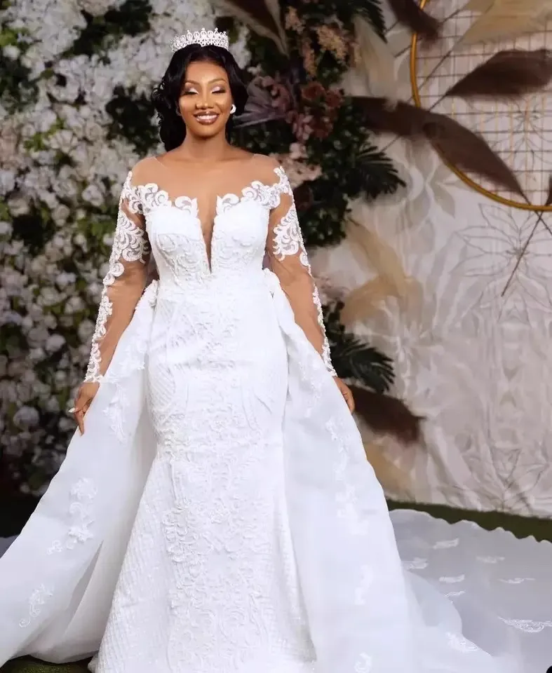 Mermaid Wedding Dress for Women 2023 With Detachable Train Scoop Long Illusion Sleeves Lace Appliques Satin Bridal Gowns Vestidos De Noiva African