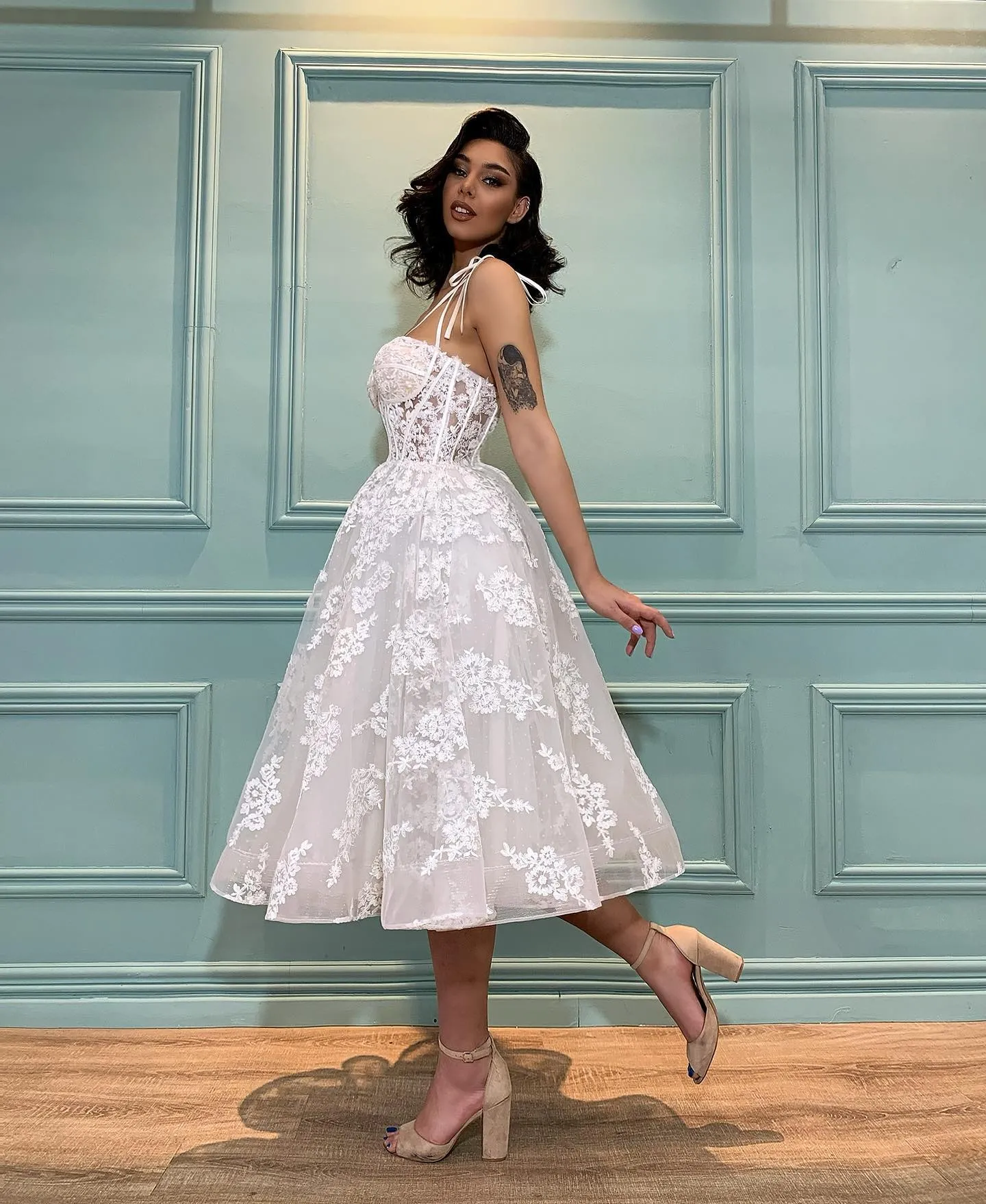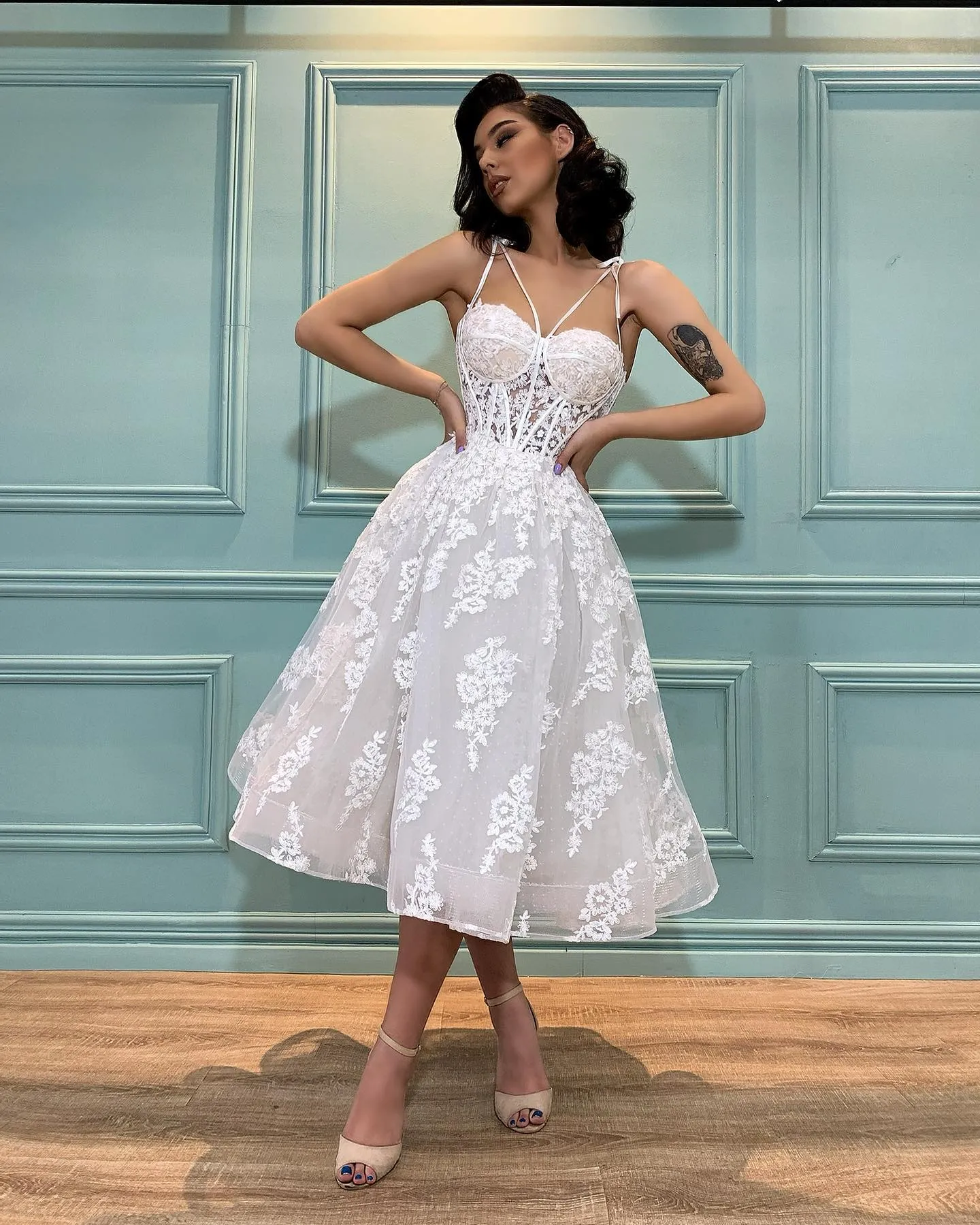 Romantic Short A Line Wedding Dresses Spaghetti Lace Wedding Dress Bone Bodice Tea-length