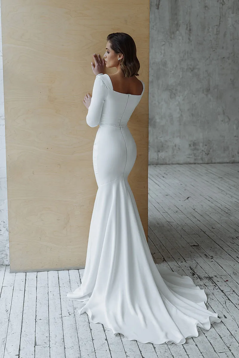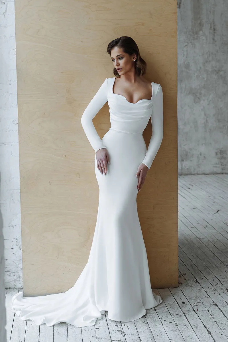 Modern White Satin Mermaid Wedding Dresses With Long Sleeves Simple Boho Garden Bridal Gowns Pleated Solid Sweep Train Reception Party Gowns