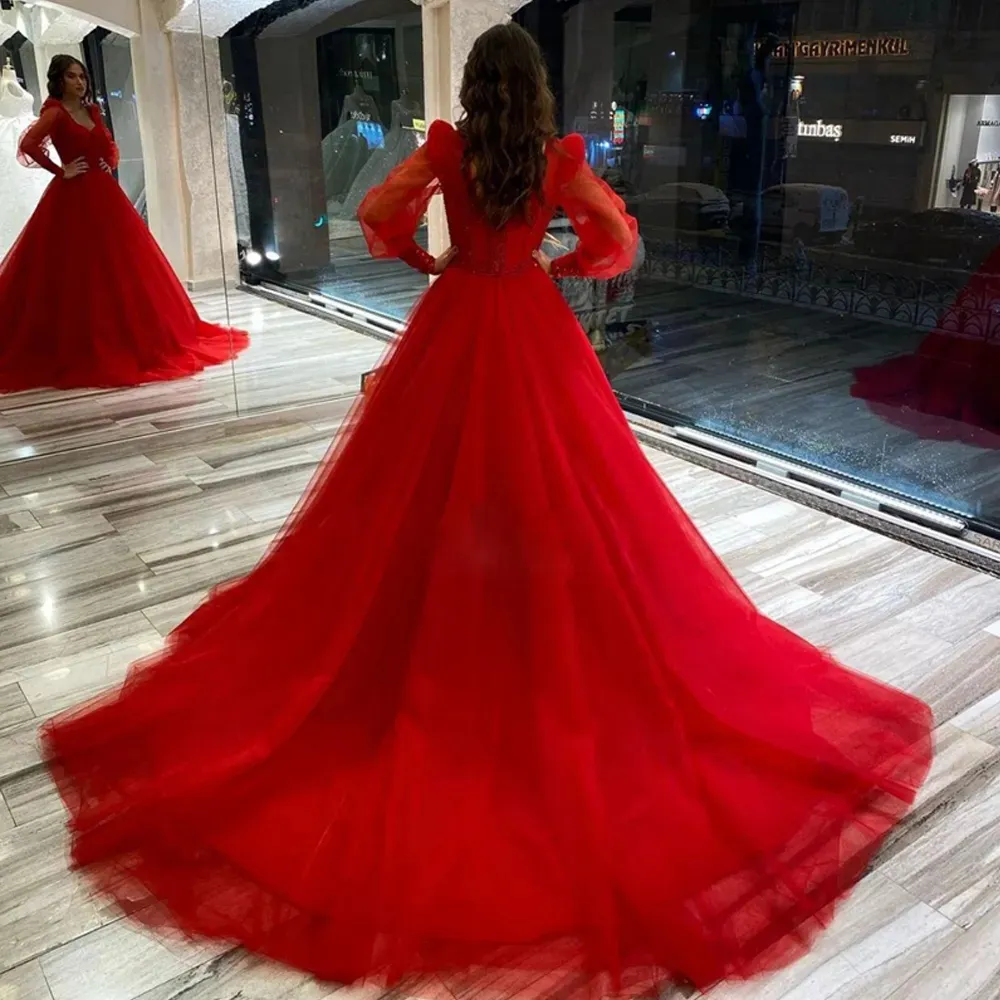 Red A Line Wedding Dresses Puffy Sleeve Beading Bridal Gown Sweetheart Tulle Vestido De Festa