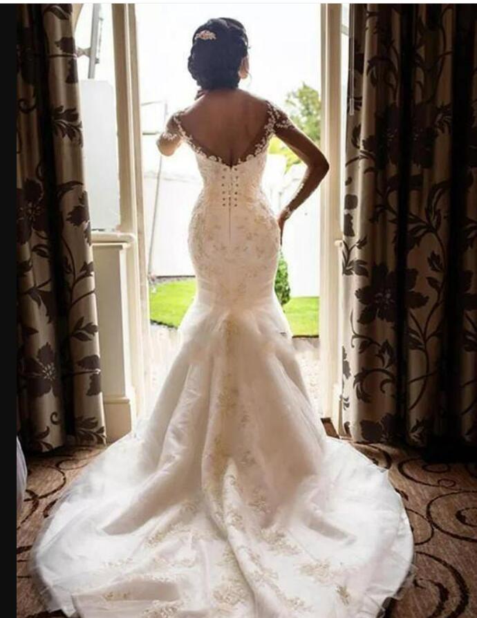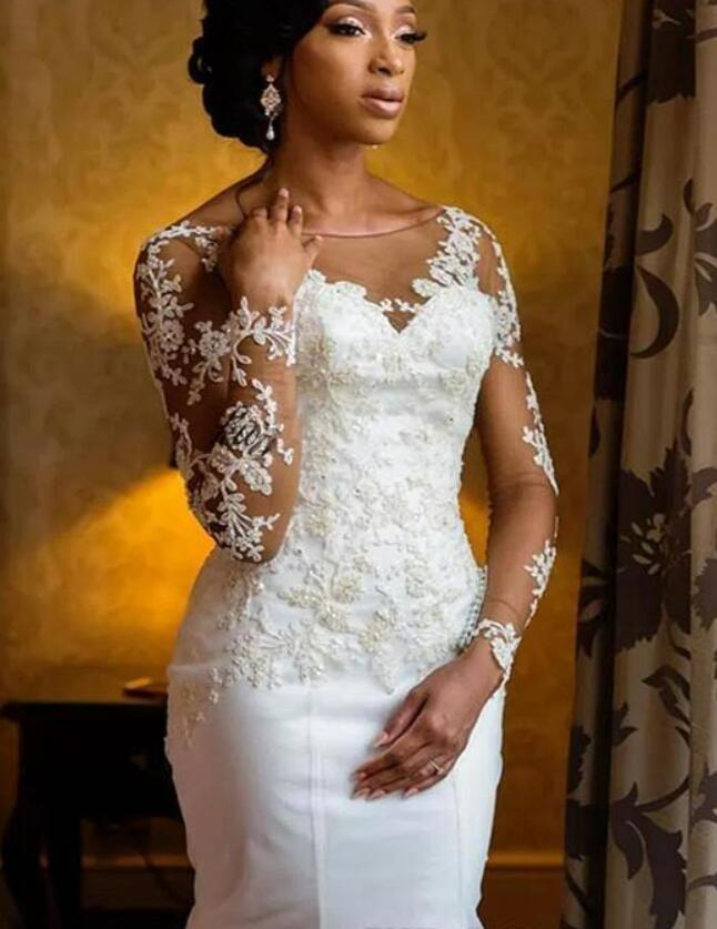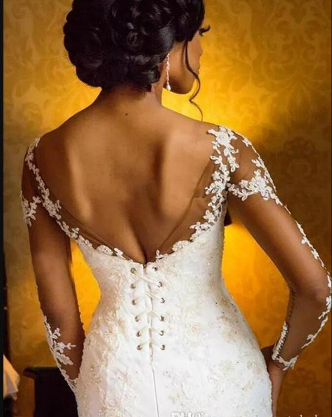 Plus Size Mermaid Wedding Dress 2023 African Black Girls Sheer Lace Long Sleeve Sexy Backless Sweep Train Bridal Gowns Vestidos De Novia