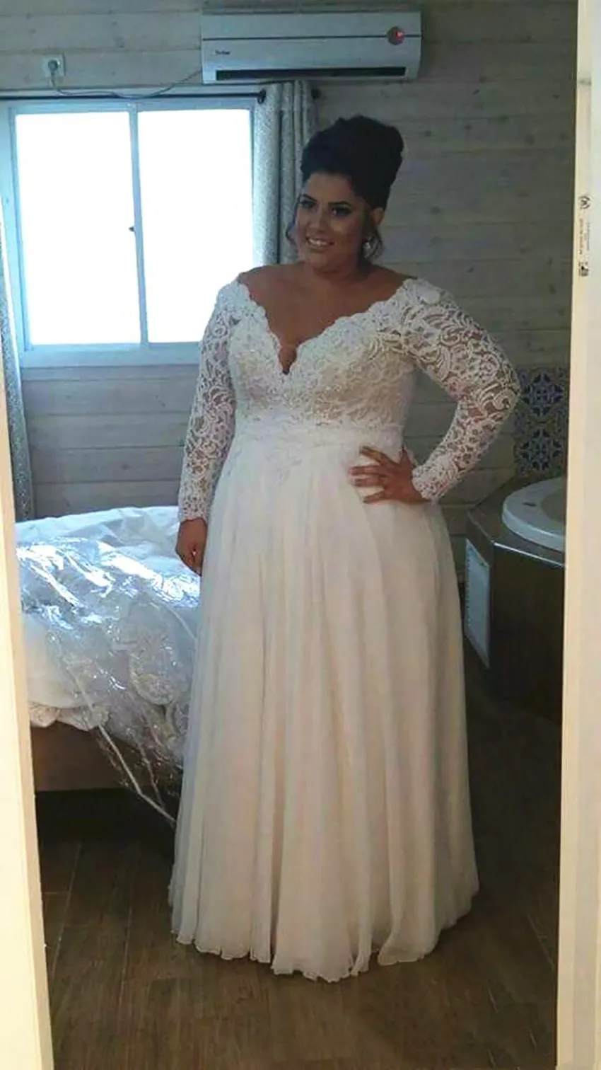 Plus Size Wedding Dresses Lace Top Long Sleeve Deep V Neck Floor Length 2021 New Elegant Bridal Gowns Custom Size
