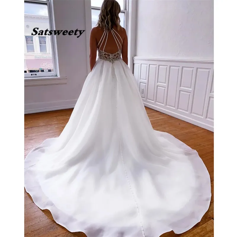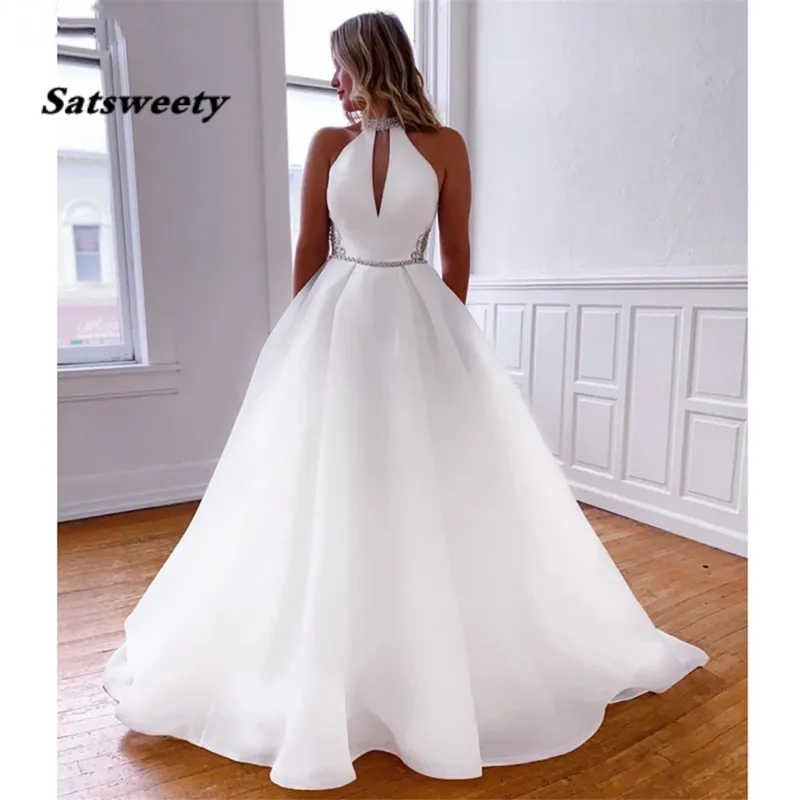 A Line White Organza Wedding Dresses Simple Heyhole High Neck Crystals Bridal Gowns robe de mariage