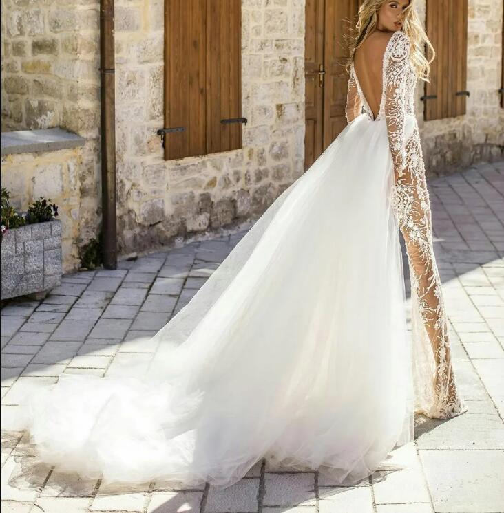 Gorgeous Wedding Jumpsuits With Detachable Train Deep V Neck Lace Appliqued Long Sleeves Wedding Dress Customize Backless Bridal Gowns