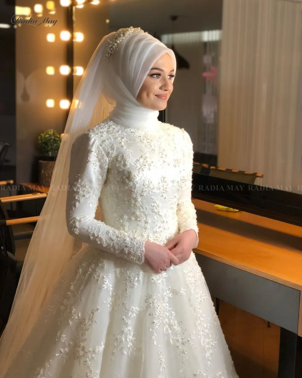 Muslim Beaded Lace Wedding Dresses High Neck A Line Long Sleeves Bridal Gowns Sweep Train robe de mariée