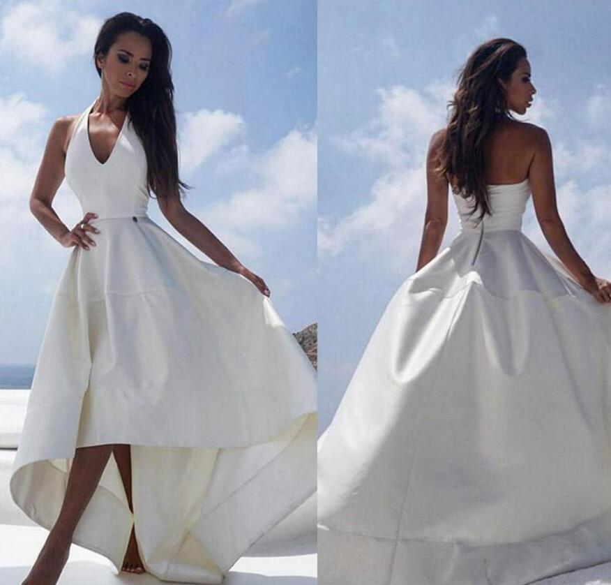 White Satin High Low Beach Wedding Dress Halter V-neck Sexy Backless Reception Dress For Women Summer Bridal Party Gowns