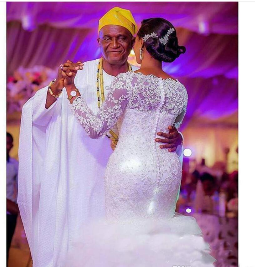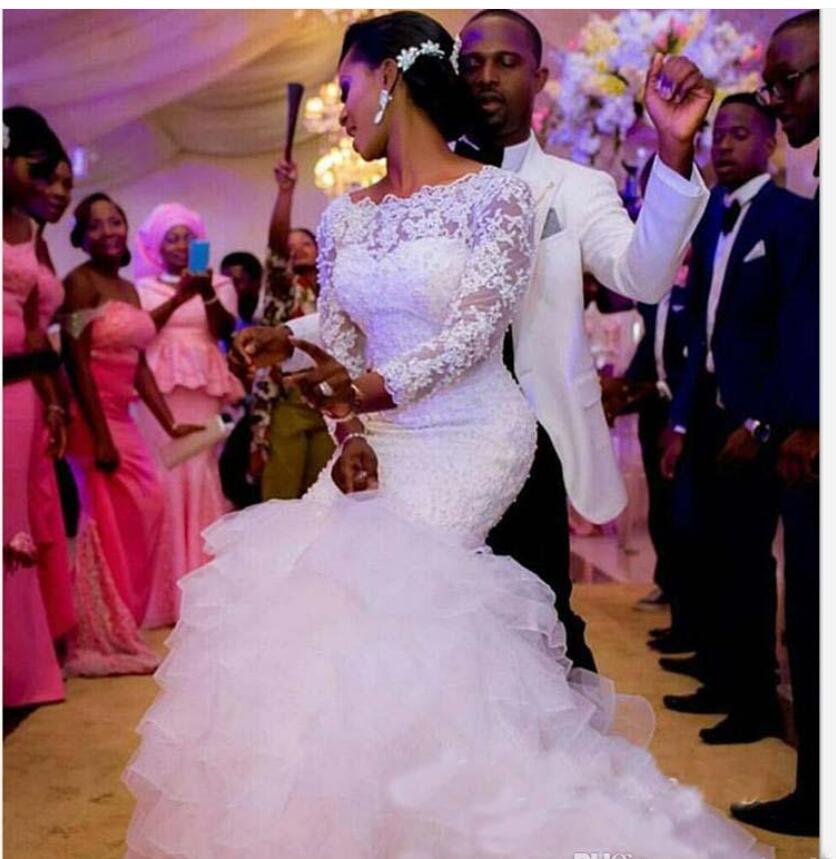 Sheer Lace Wedding Gown With Long Sleeves 3D-Floral Appliques Beads Tiered Organza Ruffles Skirt Mermaid Plus Size Women Wedding Dress