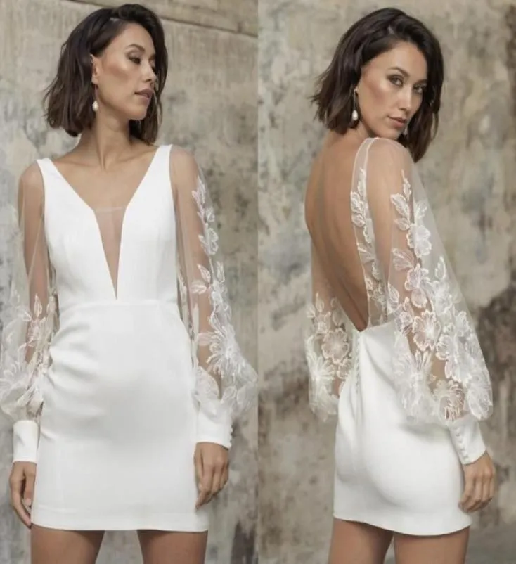 Chic Short Wedding Dresses for Bride Second Reception Gowns Lace Long Sleeved Open Back Party vestido de novia