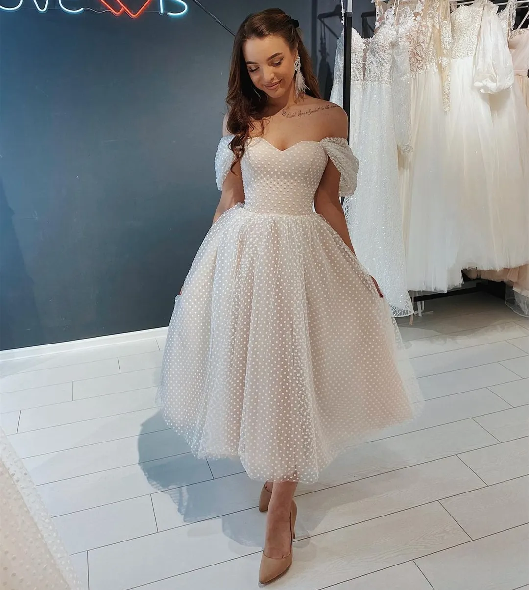 Short Wedding Dress Off Shoulder Ankle Length Point Net Bridal Gown Gorgeous For Women Brides Tulle Robe De Mariee Graceful