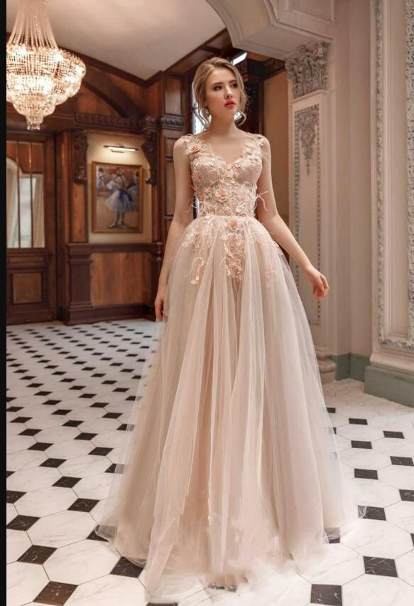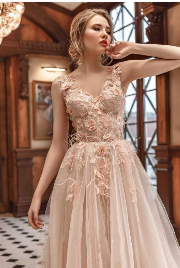 Feather 3D Floral Appliques Wedding Dresses With Beads Light Pink A Line Bridal Gowns Zipper V Sheer Neck Vestidos De Novia
