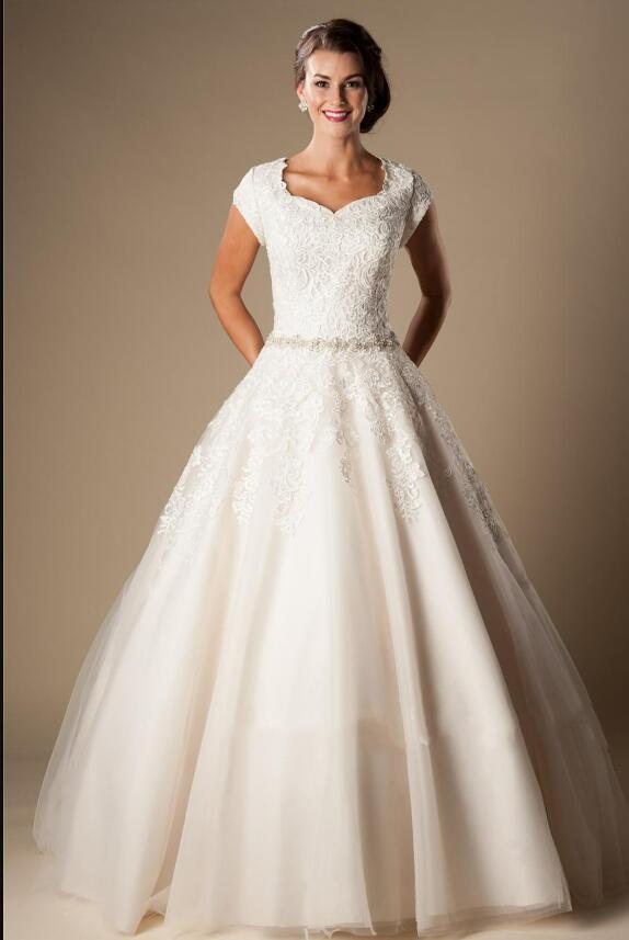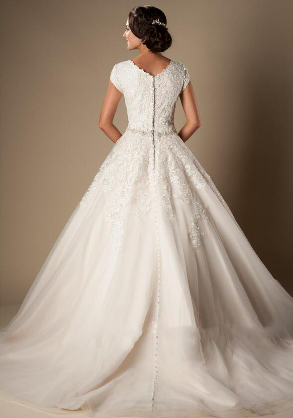 Ivory Lace Tulle Ball Gown Modest Wedding Dresses Cap Sleeves Short Sleeves Princess Bridal Gowns Beaded Belt Bridal Gowns Button Back