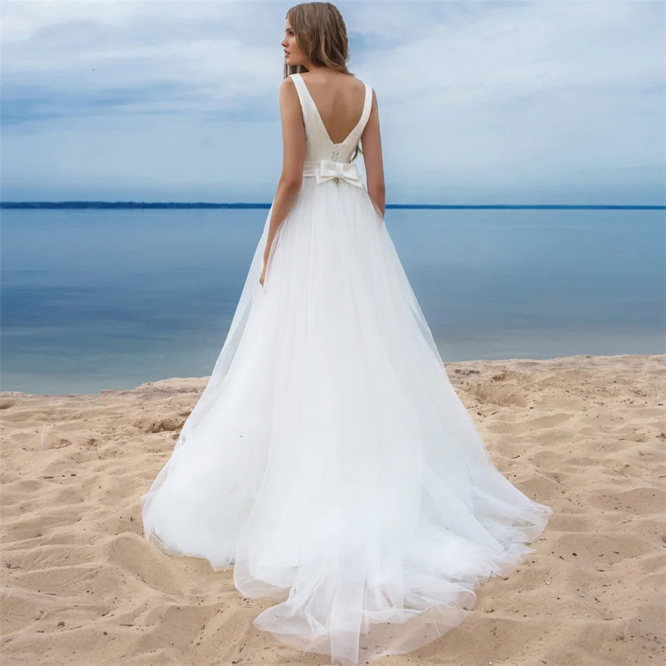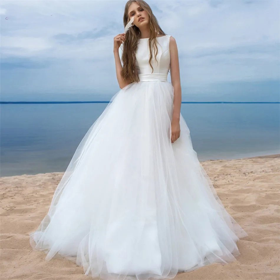 Simple Beach Wedding Dresses Sleeveless Scoop Neck Tulle Bridal Gowns V-Shape Back Formal Long Vestidos De Soiree Boho