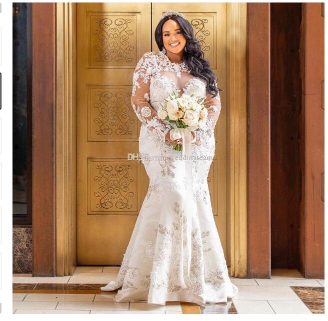 Fabulous Plus Size Mermaid Lace Wedding Dresses With Detachable Train Jewel Neck Beaded Long Sleeves Bridal Gowns Tulle Vestido De Novia