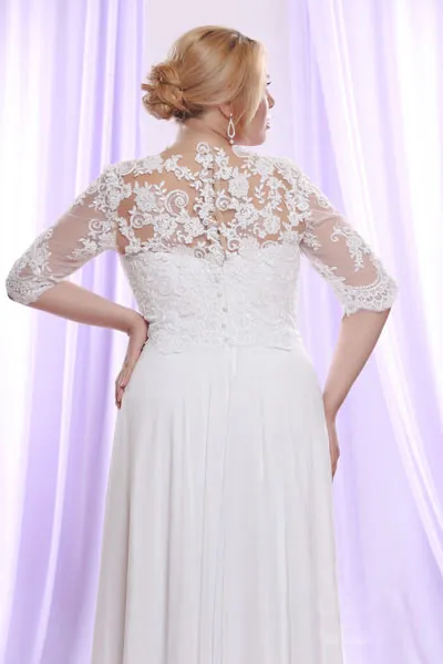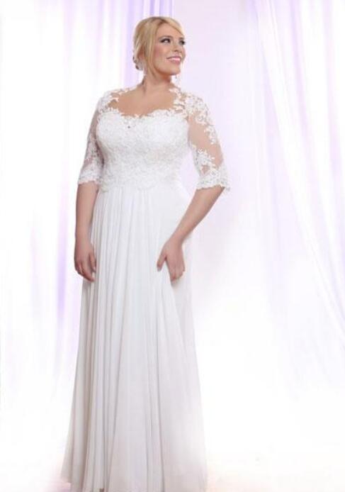 Lace Plus Size Wedding Dresses With Sleeves Sheer Bateau Neck A-Line Bohemian Wedding Dress Floor Length Chiffon Beach Bridal Gowns