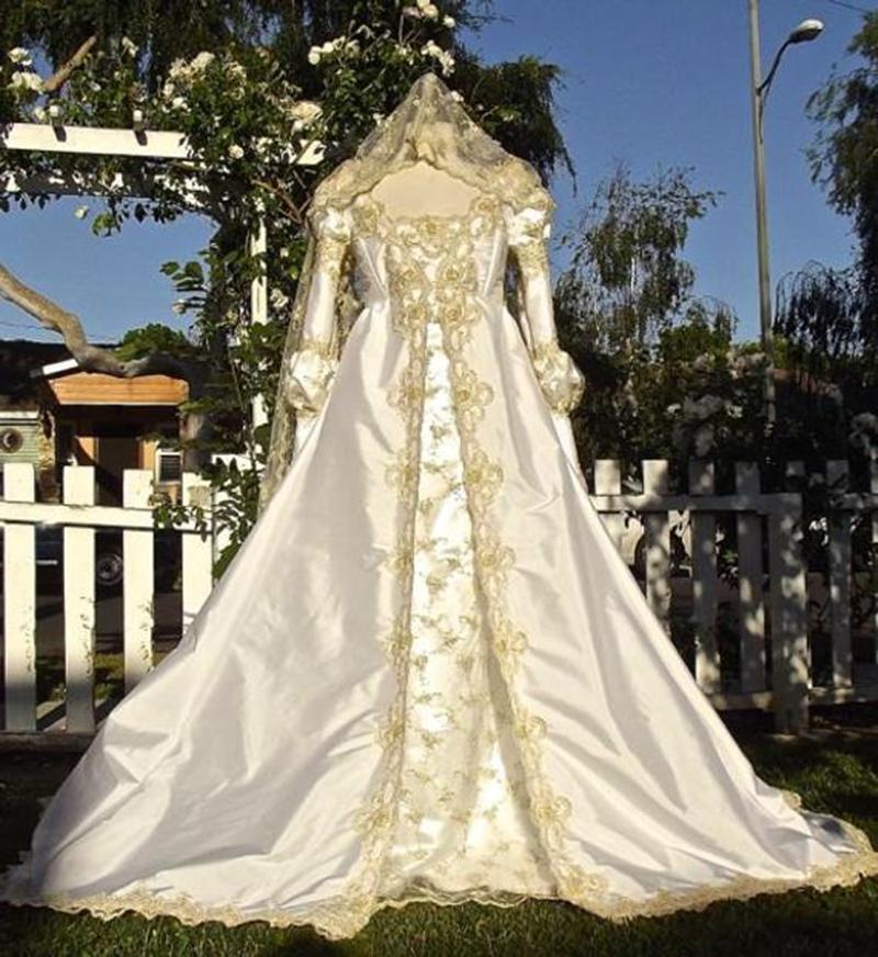 Gothic Victorian Fantasy Wedding Dress Long Sleeve Satin A Line Bridal Gown With Hat Wrap Gold Lace Appliqued Vintage Wedding Dresses
