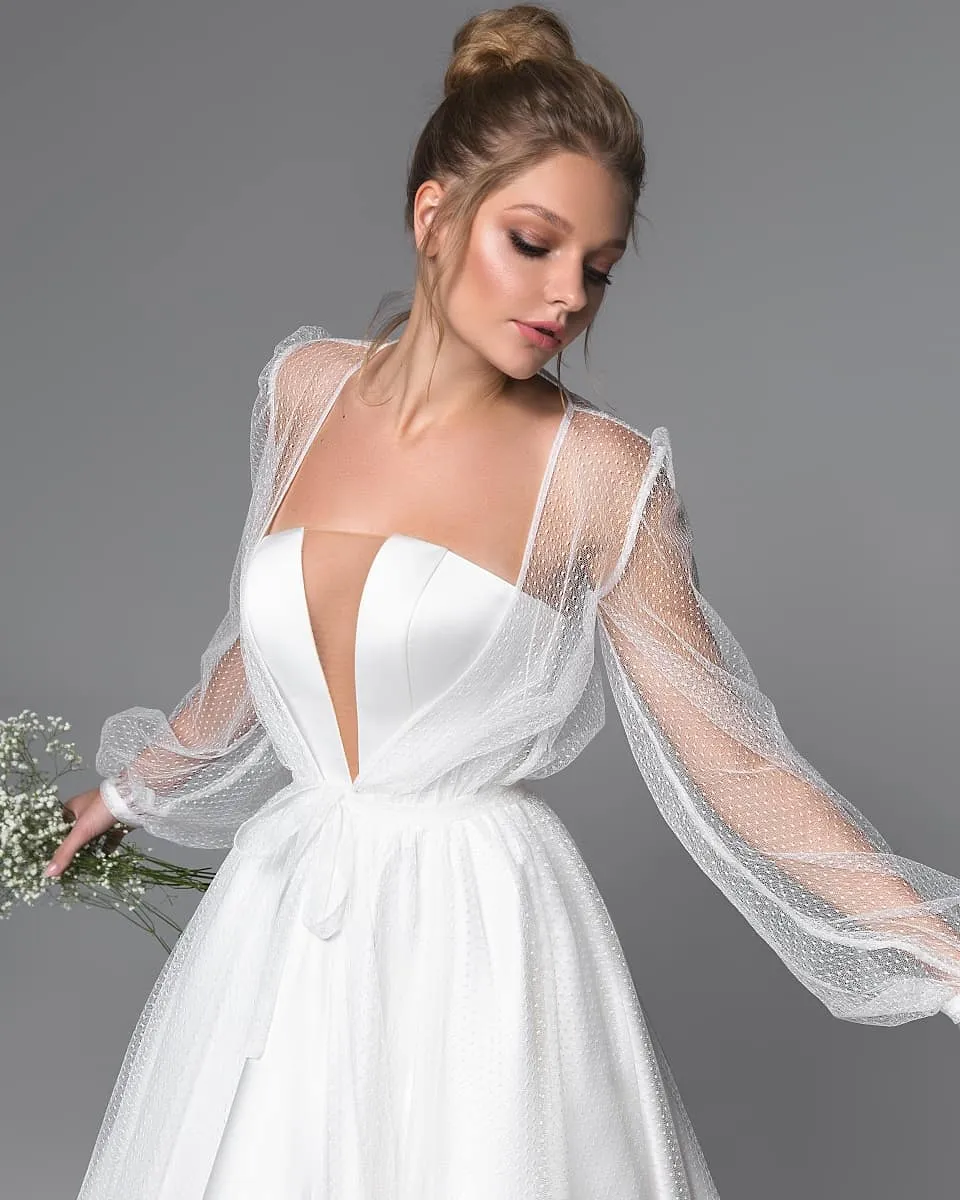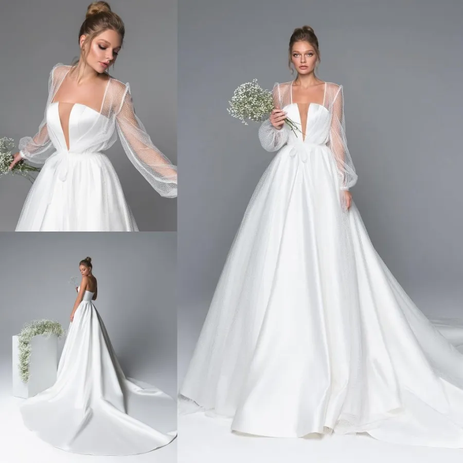 Amazing A Line Satin Wedding Dresses With Long Sleeves Jacket Sheer Plunging Neck Bridal Gowns Sweep Train robe de mariée