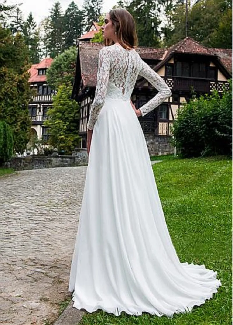 Scoop Lace Long Sleeves Chiffon A-Line Wedding Dresses Custom Made Bridal Gowns Formal Spring Vestidos De Marriage