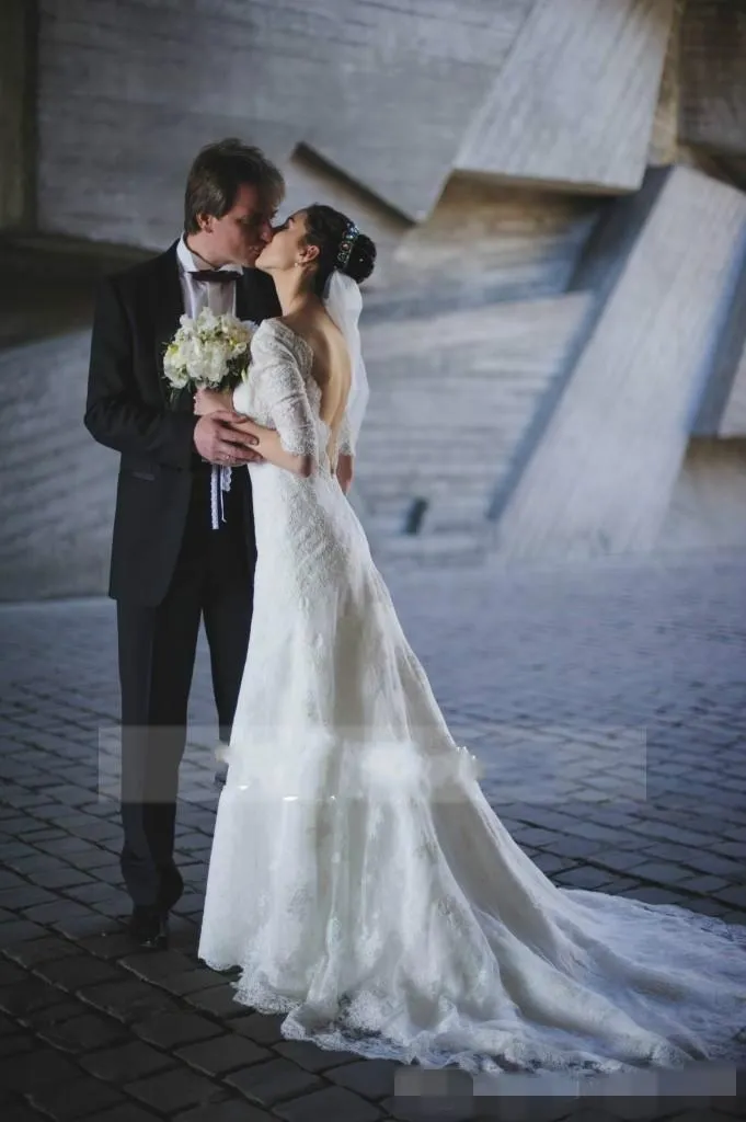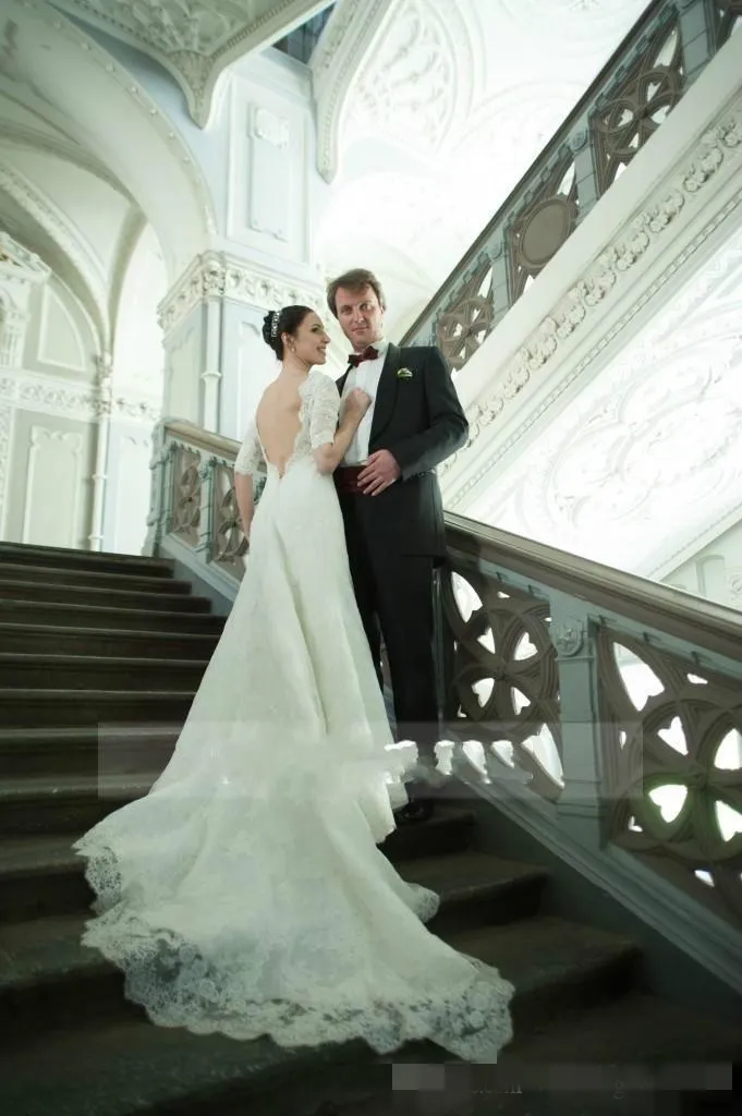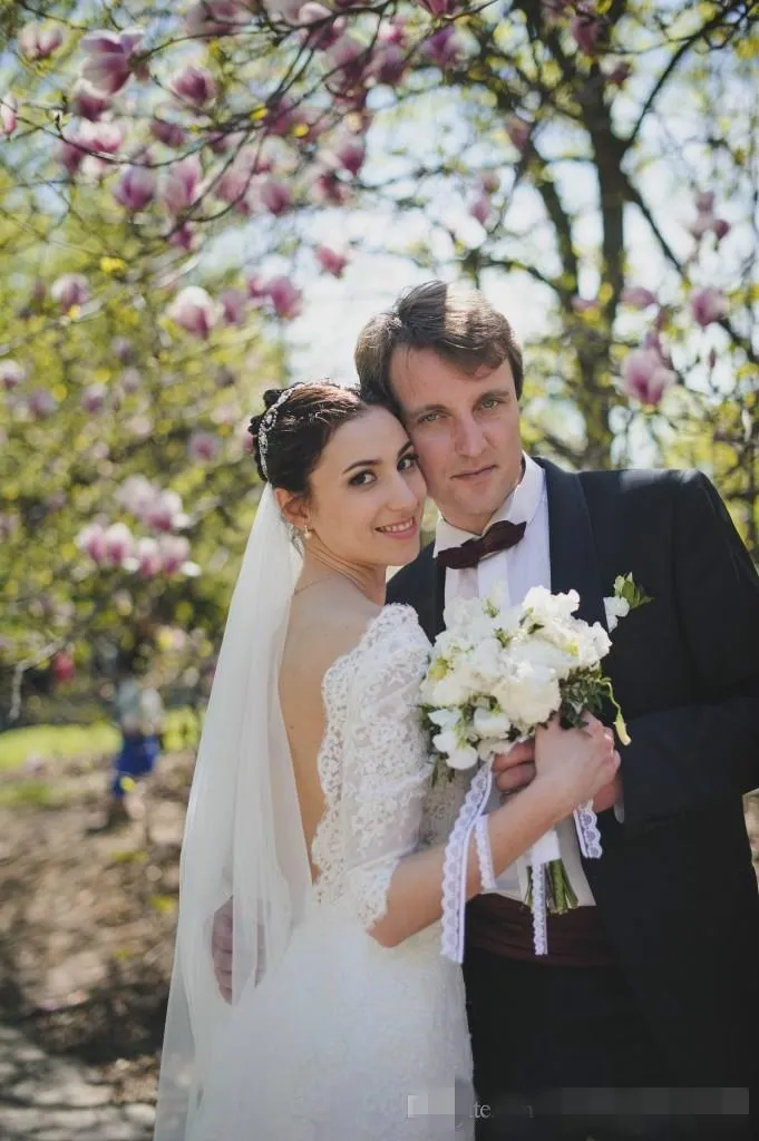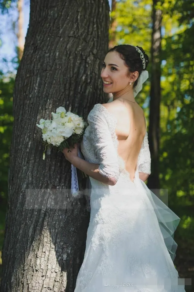 Sexy Backless Mermaid Wedding Dresses with 1/2 Half Sleeves Lace Applique Sweep Train Custom Made Country Wedding Bridal Gown