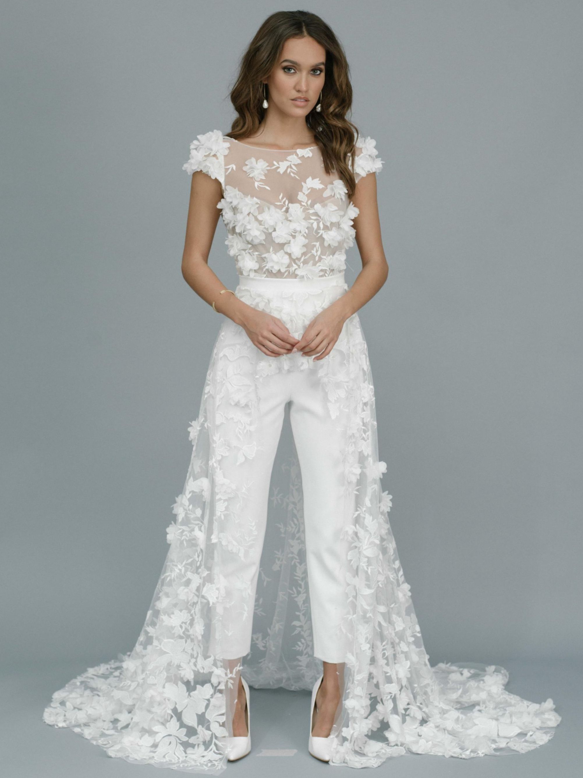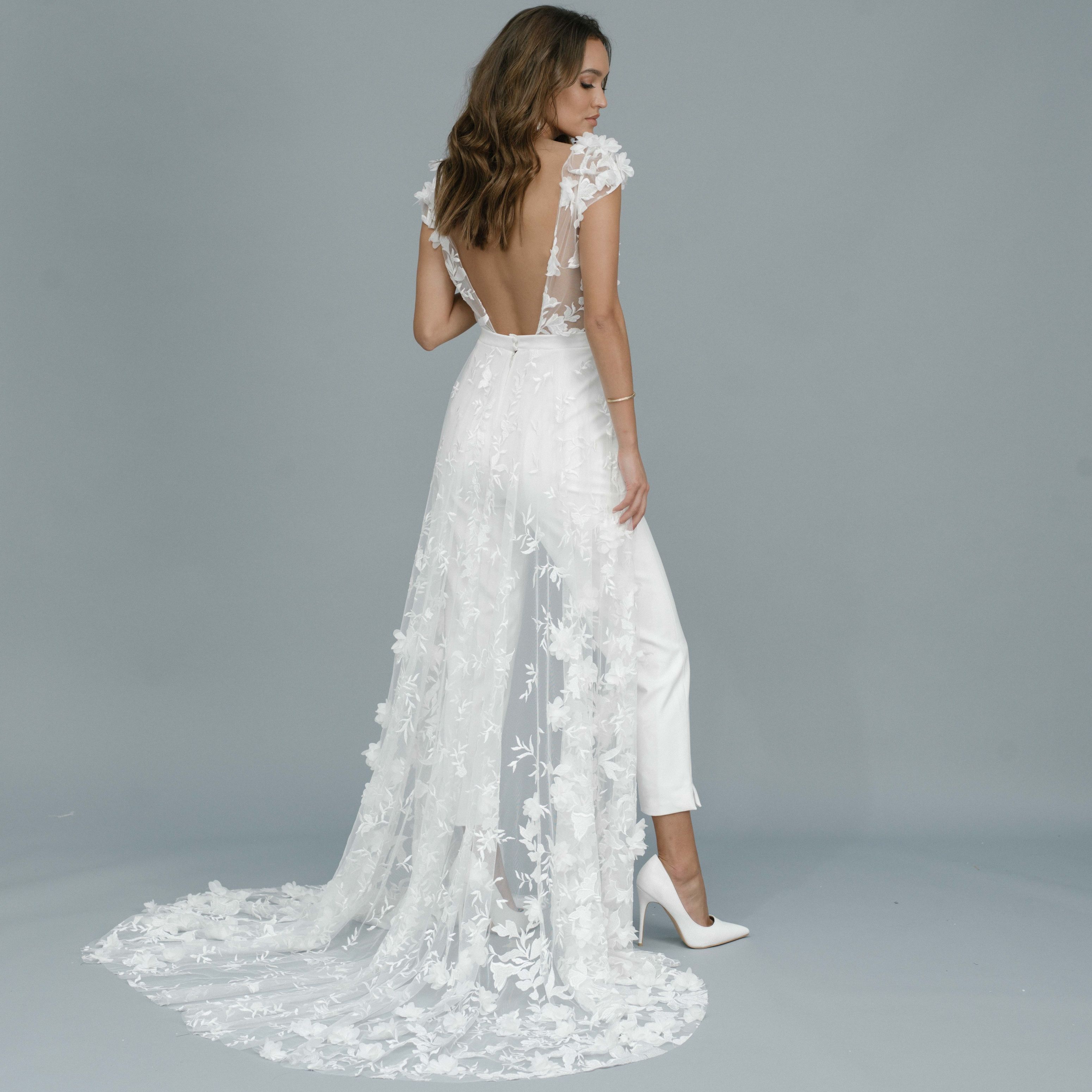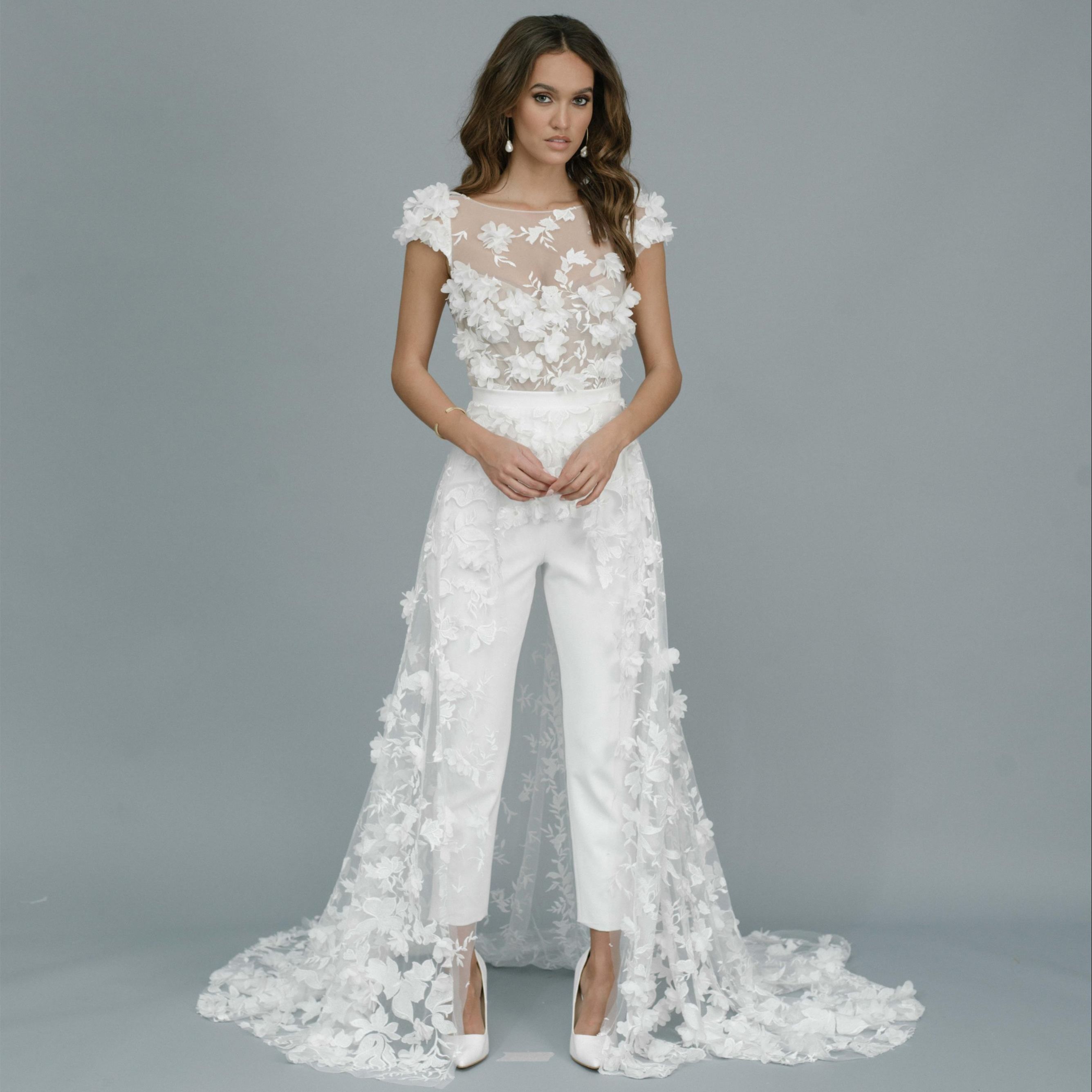 Wedding Jumpsuit with Long Train 3D Custom Floral Applique Backless Bridal Pants Suit Illusion Cap Sleeves Vestidos De Novia