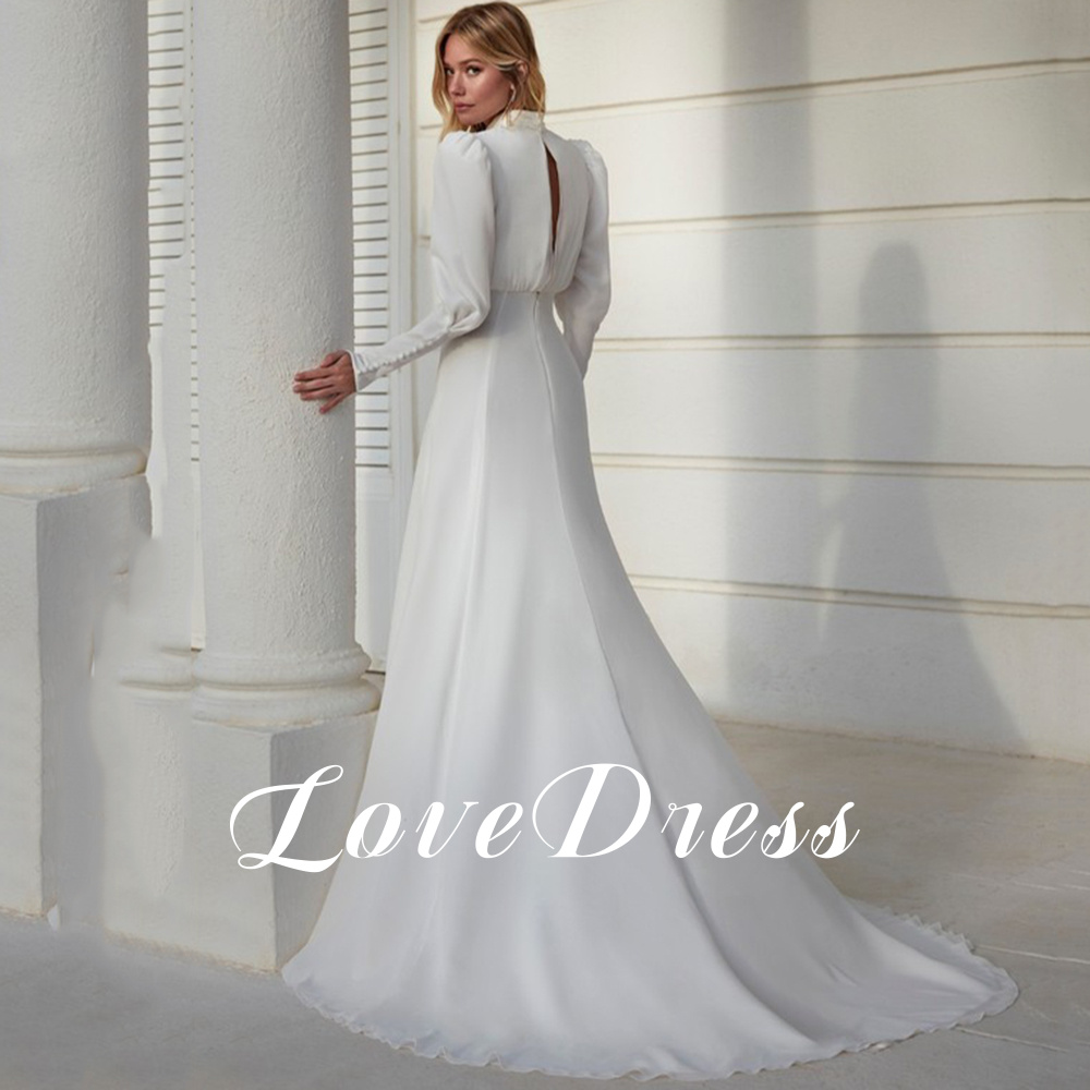 Modern High Neck White Chiffon Wedding Dress For Women Long Lantern Sleeve Pleats Elegant Sheath Bride Gown Button Sweep Train