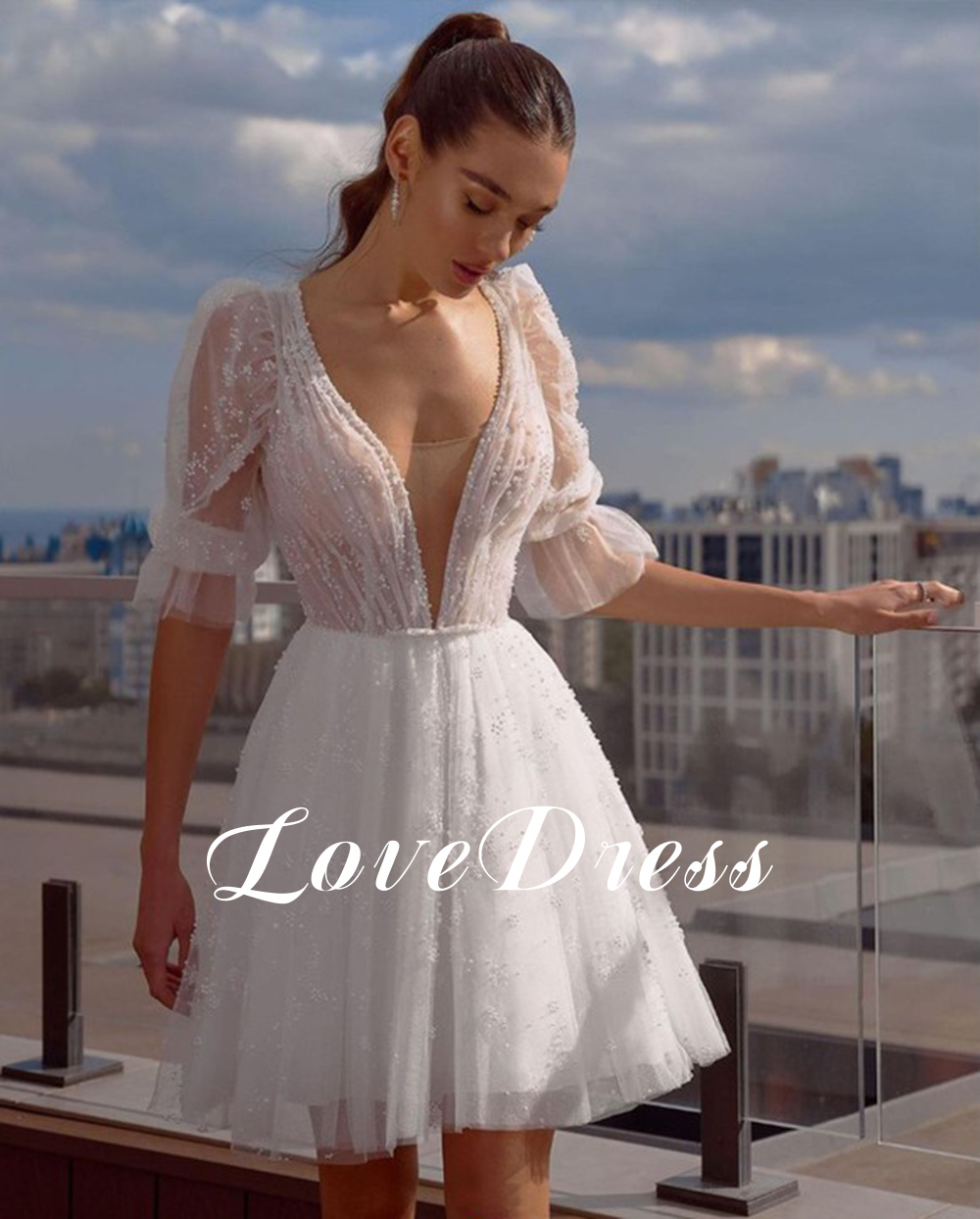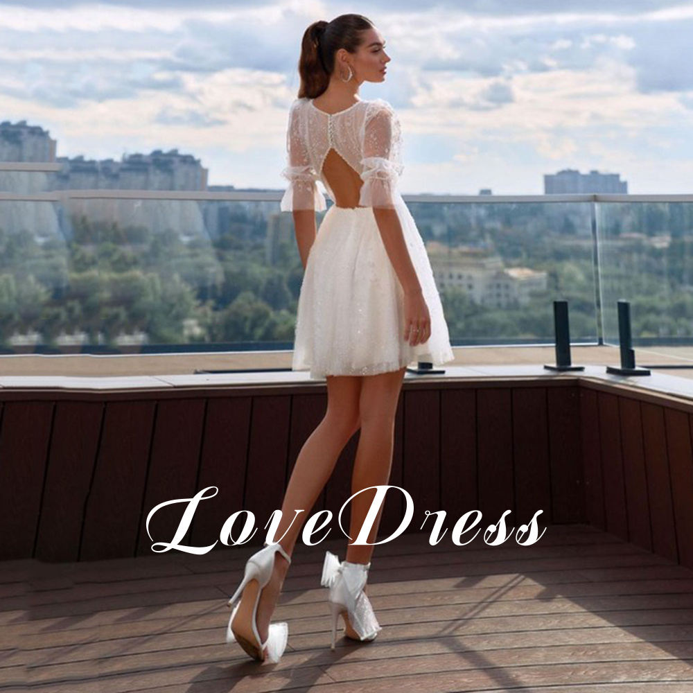 Beach Deep V-Neck Short Wedding Dress Half Sleeve Lace Appliques Boho Mini Bride Gown Backless Button Vestido De Noiva