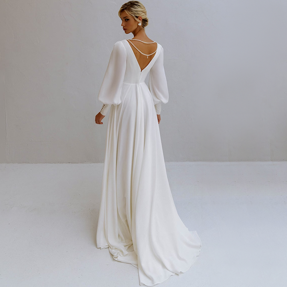 V-Neck Wedding Dress Long Sleeve A-Line Pleats Pears Simple Chiffom Bride Gown Backless Zipper Train Vestido De Novia